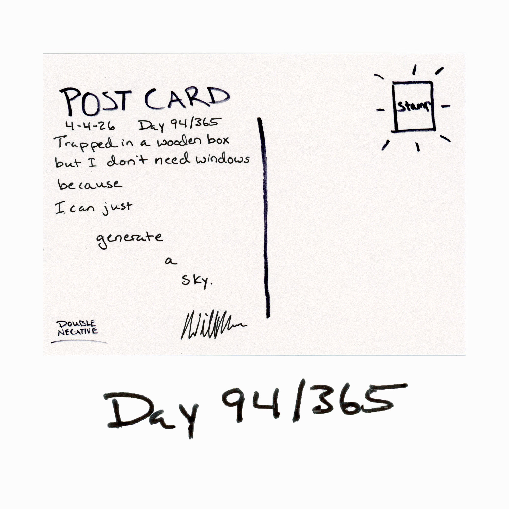 Postcards From Nowhere in ParticularGenerateDay 94/365Will MaloneApr 05, 20264ShareFor $5 I’ll send this postcard to YOU! https://willmalone.com/collections/postcardsDouble Negative Dispatch is a reader-supported publication. To receive new posts and support my work, consider becoming a free or paid subscriber.Subscribe