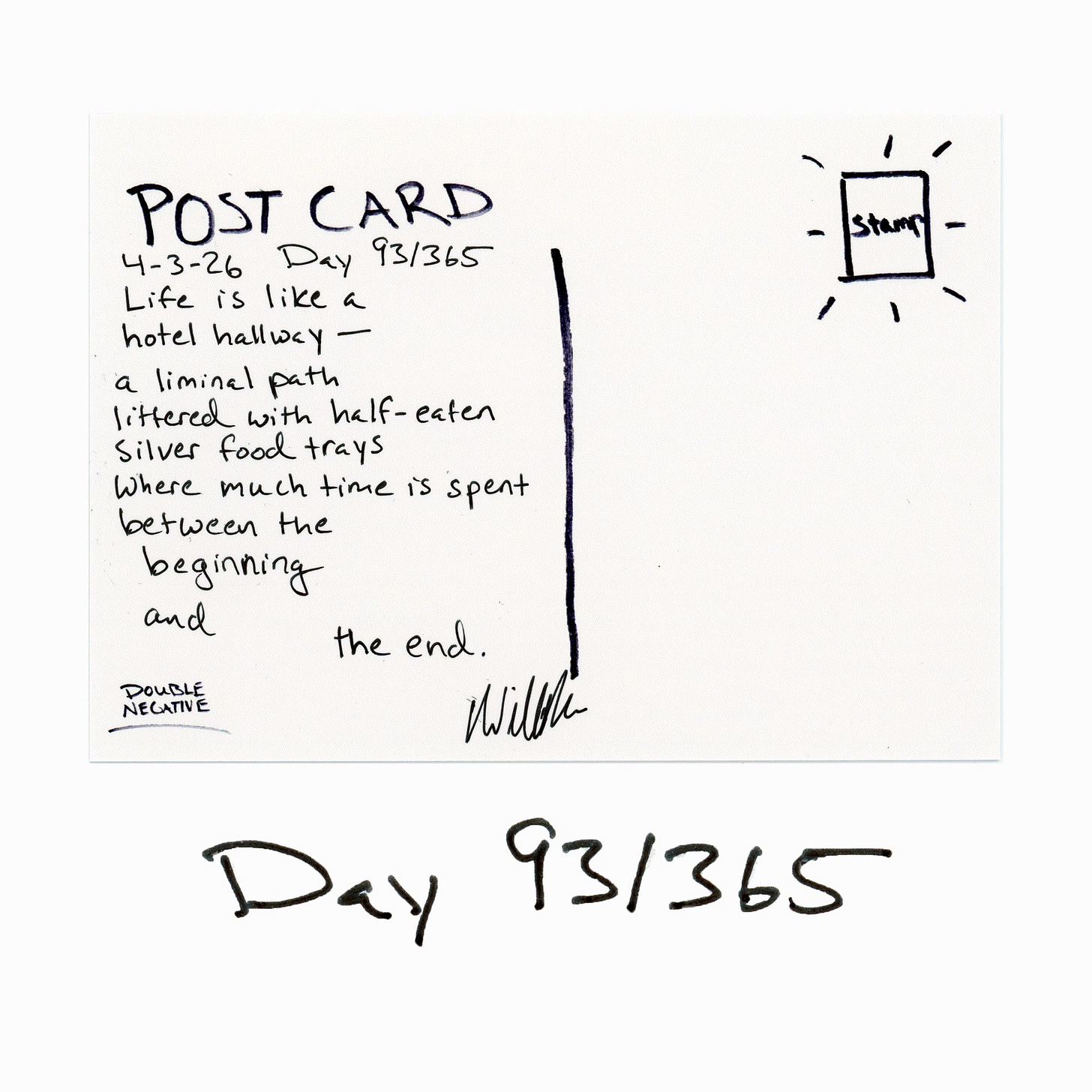 Postcards From Nowhere in ParticularHotel HallwaysDay 93/365Will MaloneApr 04, 202641ShareFor $5 I’ll send this postcard to YOU! https://willmalone.com/collections/postcardsDouble Negative Dispatch is a reader-supported publication. To receive new posts and support my work, consider becoming a free or paid subscriber.Subscribe