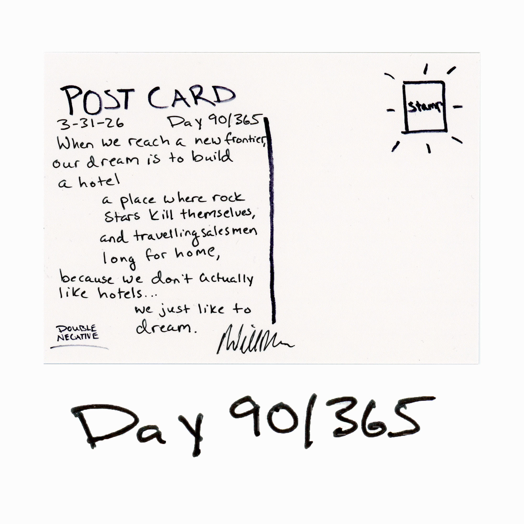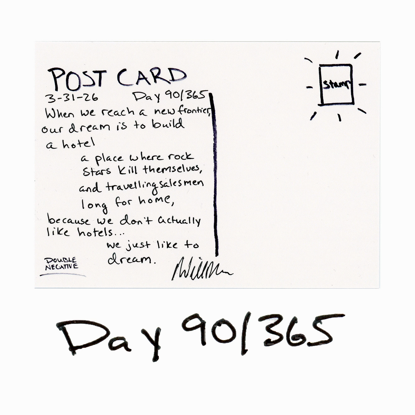 Postcards From Nowhere in ParticularHotelsDay 90/365Will MaloneApr 01, 20266ShareFor $5 I’ll send this one to YOU! https://willmalone.com/collections/postcardsDouble Negative Dispatch is a reader-supported publication. To receive new posts and support my work, consider becoming a free or paid subscriber.Subscribe