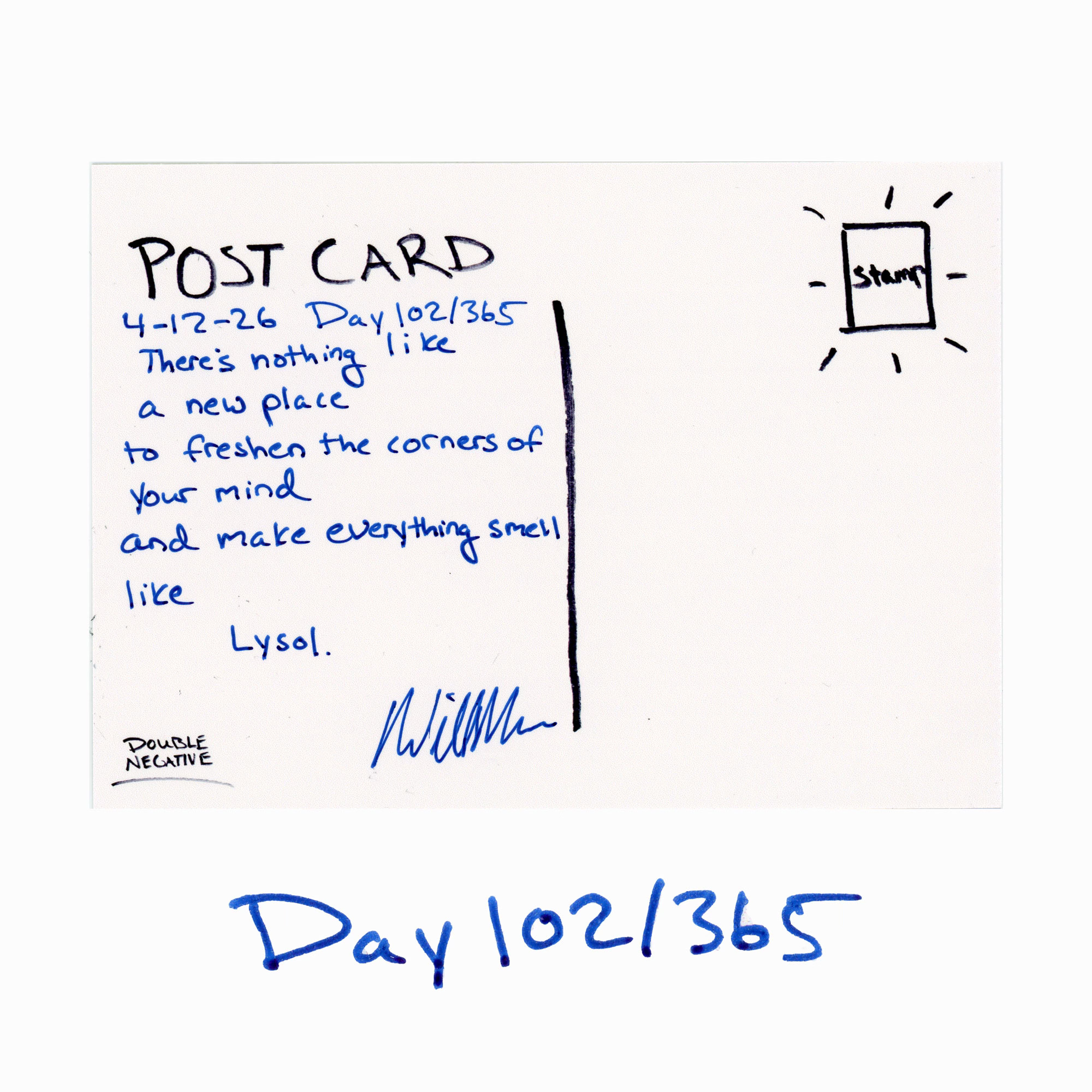 Postcards From Nowhere in ParticularLysolDay 102/365Will MaloneApr 13, 202661ShareFor $5 I’ll send this postcard to YOU! https://willmalone.com/collections/postcardsDouble Negative Dispatch is a reader-supported publication. To receive new posts and support my work, consider becoming a free or paid subscriber.Subscribe