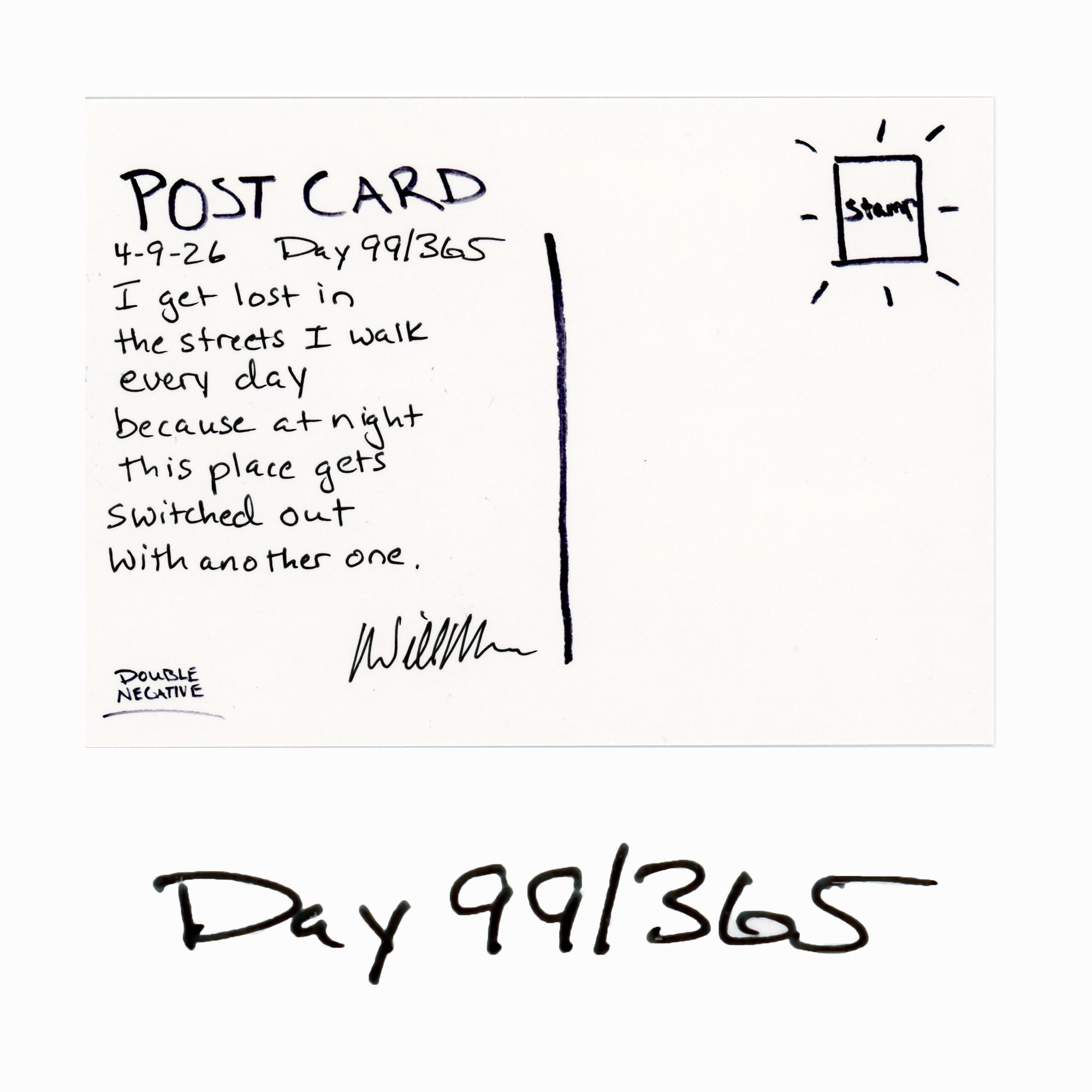 Postcards From Nowhere in ParticularNightwalkDay 99/365 Will MaloneApr 10, 20267ShareFor $5 I’ll send this postcard to YOU! https://willmalone.com/collections/postcardsDouble Negative Dispatch is a reader-supported publication. To receive new posts and support my work, consider becoming a free or paid subscriber.Subscribe