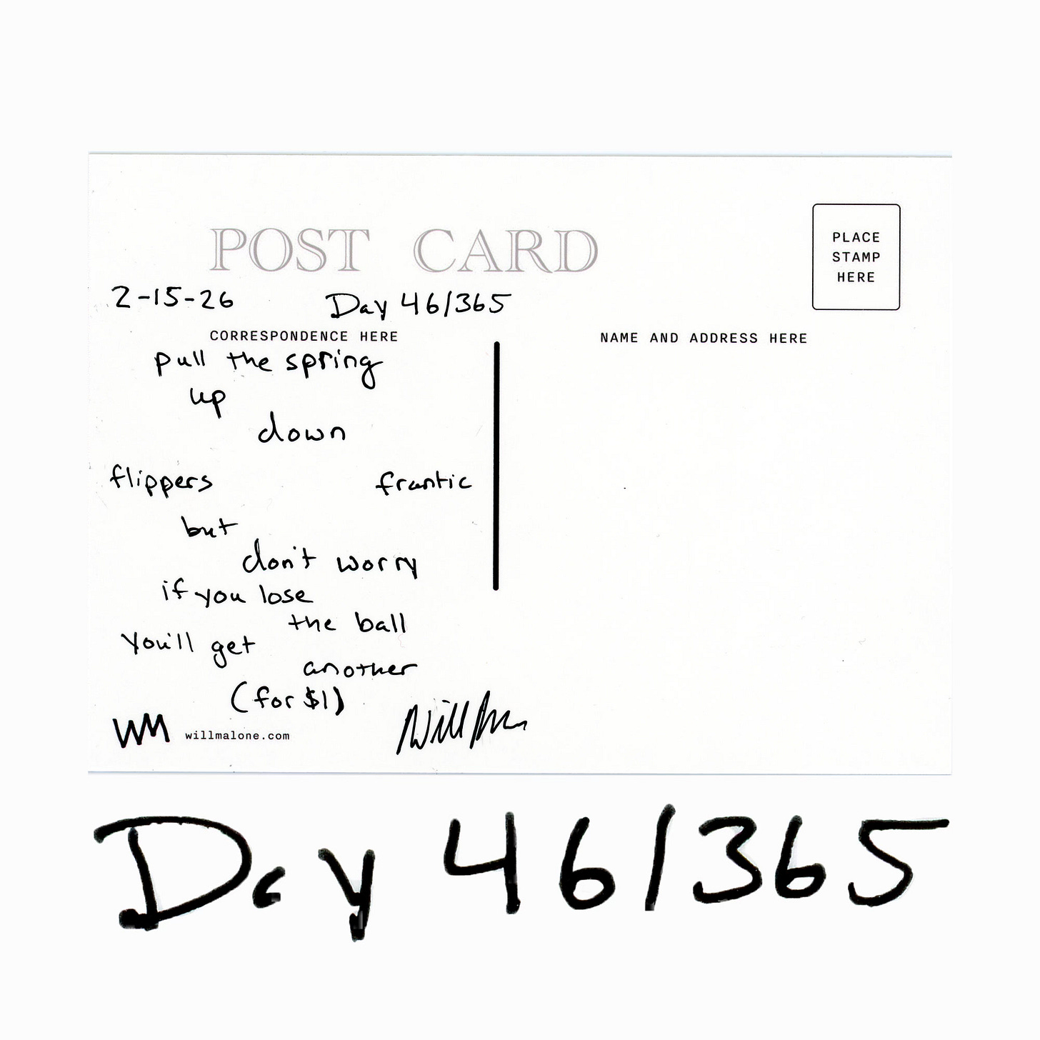 Postcards From Nowhere in ParticularPinballDay 46/365Will MaloneFeb 16, 20266ShareFor $5, I’ll send this postcard to YOU! (Remember, there’s only one!)https://willmalone.com/collections/postcardsDouble Negative Dispatch is a reader-supported publication. To receive new posts and support my work, consider becoming a free or paid subscriber.Subscribe