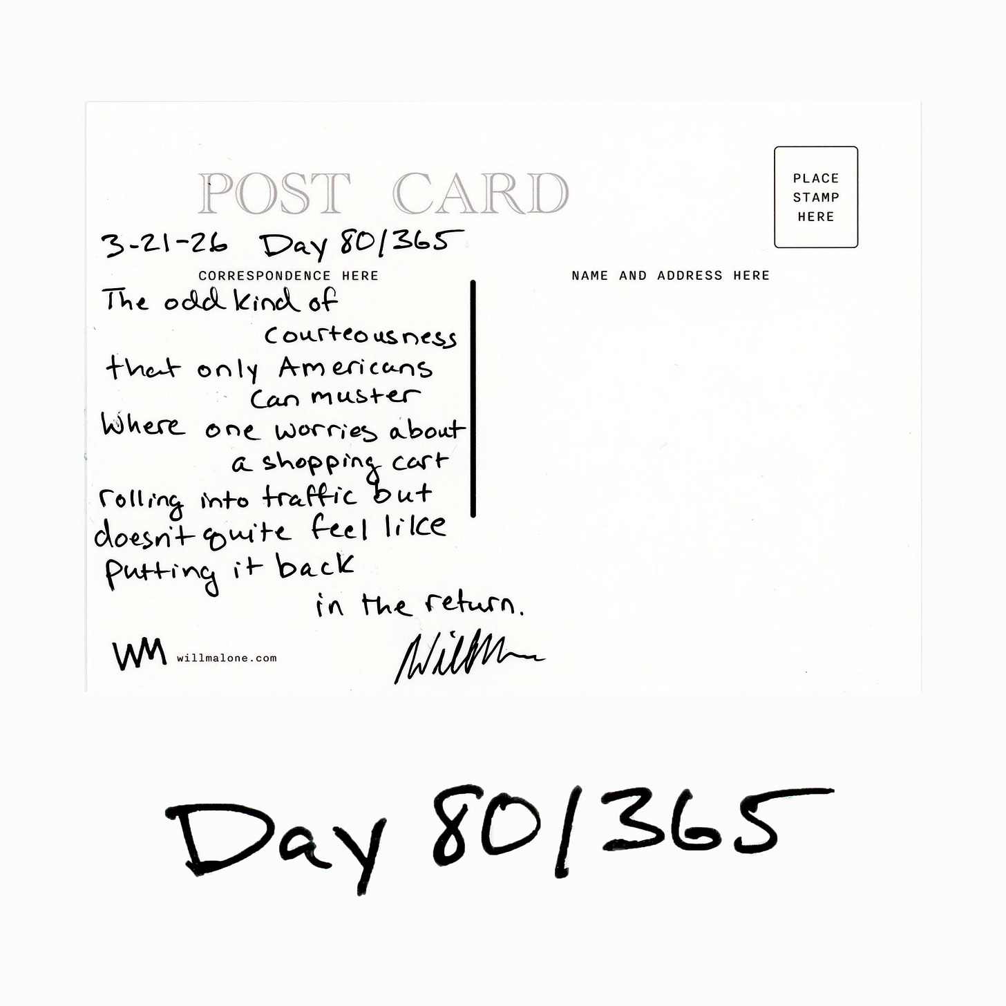 Postcards From Nowhere in ParticularThe Odd KindDay 80/365 Will MaloneMar 22, 202651ShareFor $5 I’ll send this postcard to YOU! https://willmalone.com/collections/postcardsDouble Negative Dispatch is a reader-supported publication. To receive new posts and support my work, consider becoming a free or paid subscriber.Subscribe